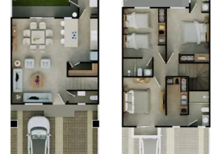 El prototipo Caoba es una residencia de dos niveles ubicada en el fraccionamiento Jardines de Ciudad Mayakoba, un desarrollo integral que combina urbanismo planificado, naturaleza y calidad de vida en Playa del Carmen. Con una construcción promedio de 147.50 m², esta vivienda está pensada para familias que buscan amplitud, funcionalidad y un entorno seguro y sustentable. ✨ Características principales: - Tres recámaras, incluyendo una recámara principal con walking closet, diseñada para brindar privacidad y confort. - Amplia sala-comedor, ideal para convivencias familiares y momentos de descanso. - Distribución inteligente en dos niveles, que separa las áreas sociales de las privadas para mayor funcionalidad. - Dos lugares de estacionamiento, garantizando comodidad y seguridad para los residentes. - Diseño moderno y eficiente, con acabados pensados para ofrecer durabilidad y estilo. 🌿 Caoba representa una excelente opción dentro de Jardines de Ciudad Mayakoba, un fraccionamiento que promueve la vida en comunidad, el respeto por el entorno natural y el acceso a servicios esenciales. Ideal para quienes desean vivir en un ambiente tranquilo, bien conectado y con alta plusvalía en la Riviera Maya.